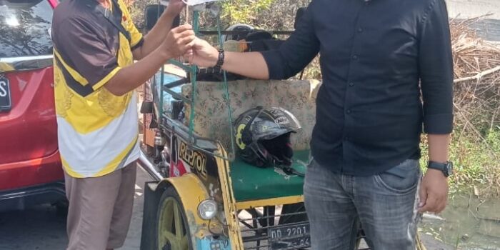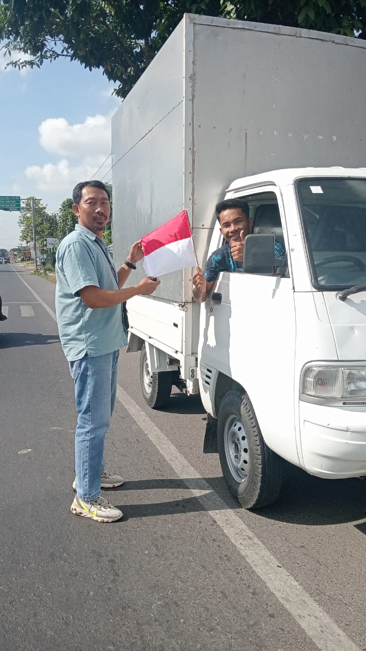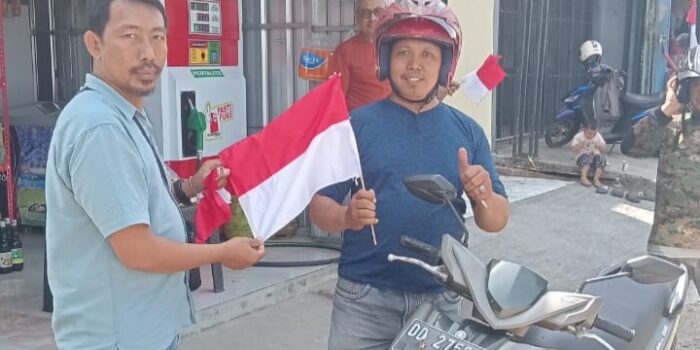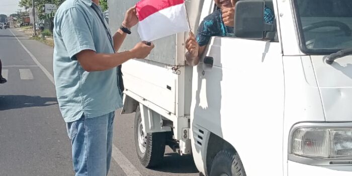 “Kami bagikan sekaligus pemasangan bendera merah putih berukuran kecil 15×10 cm kepada masyarakat, pengendara roda dua dan roda empat.