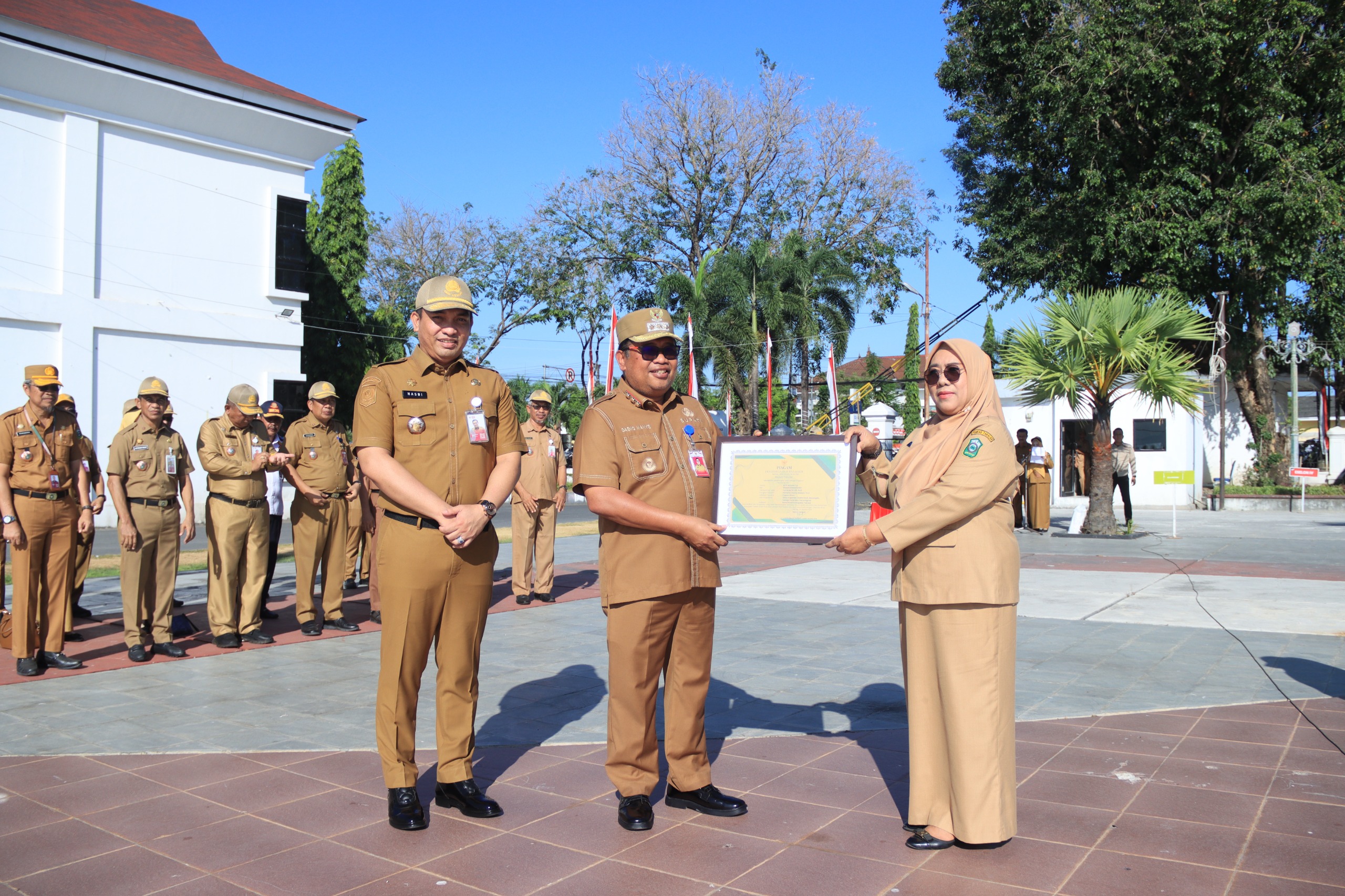 Dalam apel gabungan tersebut, Bupati Takalar didampingi Sekda Takalar menyerahkan Piagam Penghargaan Purna Bakti kepada ibu Siti Ni’ma Kasim, SE, jabatan terakhir sebagai Kepala Dinas Koperasi, Usaha Kecil Menengah, Tenaga Kerja Transmigrasi Kab. Takalar dengan masa kerja 33 Tahun.(*)