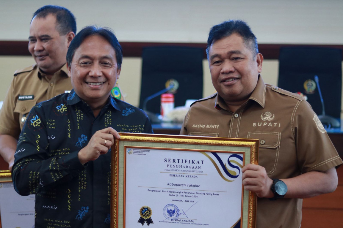 PANDUNEWS.co.id, Takalar – Pemerintah Kabupaten Takalar kembali meraih prestasi membanggakan dengan diraihnya Penghargaan Capaian Angka Penurunan Stunting Paling Besar Kedua Tahun 2024 di Sulawesi Selatan dari Menteri Kependudukan Dan Pembangunan Keluarga, Selasa 16 Desember 2025.